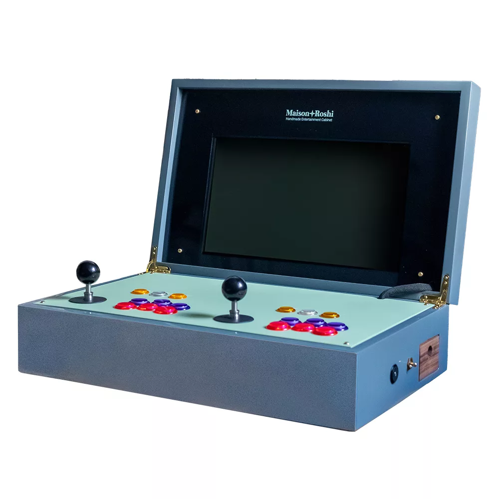 The Marianna is Maison Roshi’s first handheld arcade system, inspired by the elegance and practicality of modern handheld PCs. Designed to fold away effortlessly, it features detachable joysticks that tuck neatly into a specially crafted side draw. Compact yet versatile, it’s built for both play and display.